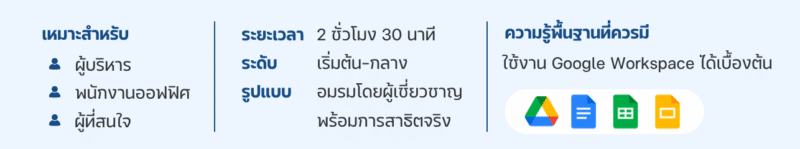 📌 ความรู้พื้นฐาน: เพียงคุ้นเคยกับการใช้ Google Workspace (Docs, Sheets, Drive) ก็สามารถเริ่มต้นเรียนรู้ได้ทันที